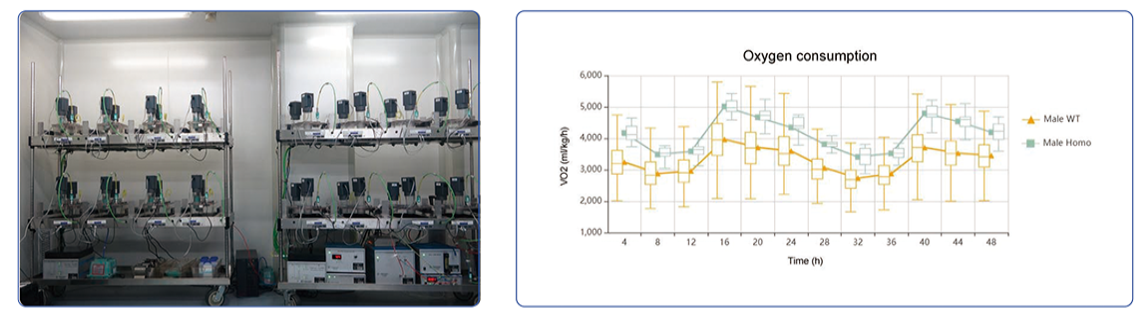 谢功能评估系统,其适用于长期监测小鼠的能量代谢活动,包括氧气消耗速率、二氧化碳生成速率、呼吸熵、进食量、饮水量、XYZ三维活动等,直观的