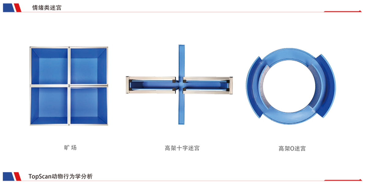 抑郁等测试相关的仪器设备,通过视频摄像机和Topscan动物行为学分析软件,检测动物的自主运动、探究行为、焦虑抑郁状况、学习记忆能力、