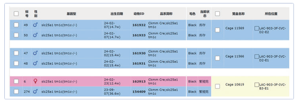 设施内所有小鼠饲养情况均可通过饲养繁育系统收集整理,包括进出人员分配、品系统计、小鼠繁殖、生崽、分笼等,发生异常情况